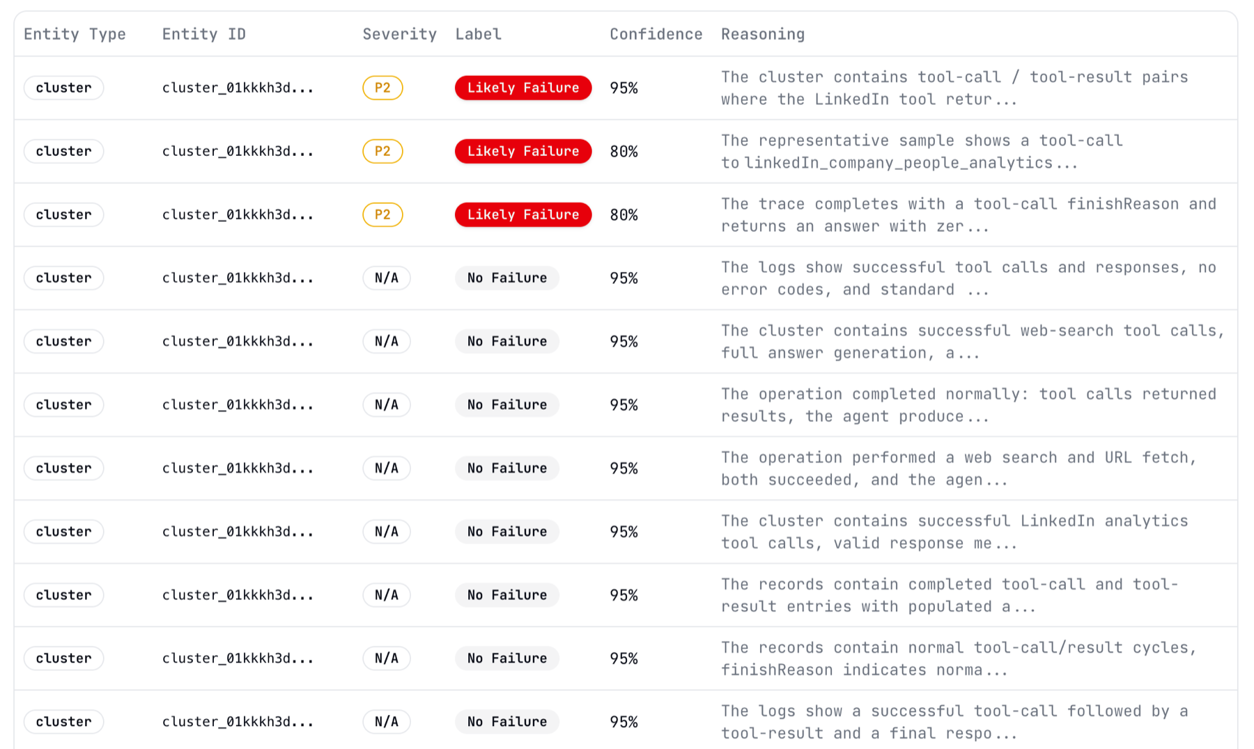 Agentic judges — not a single LLM-as-judge call — reason step by step about whether an outlier is a real problem or just a behavioral shift. Fully automatic: Moyai evaluates whether there were agentic failures in generating the result — no configuration, no rules to define.
